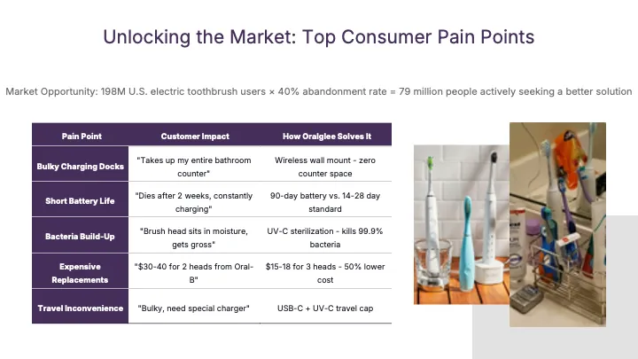 Oraglee is the first wall-mounted, self-sterilizing electric toothbrush — with $78K in pre-orders and 70% margins, disrupting a $12B market.